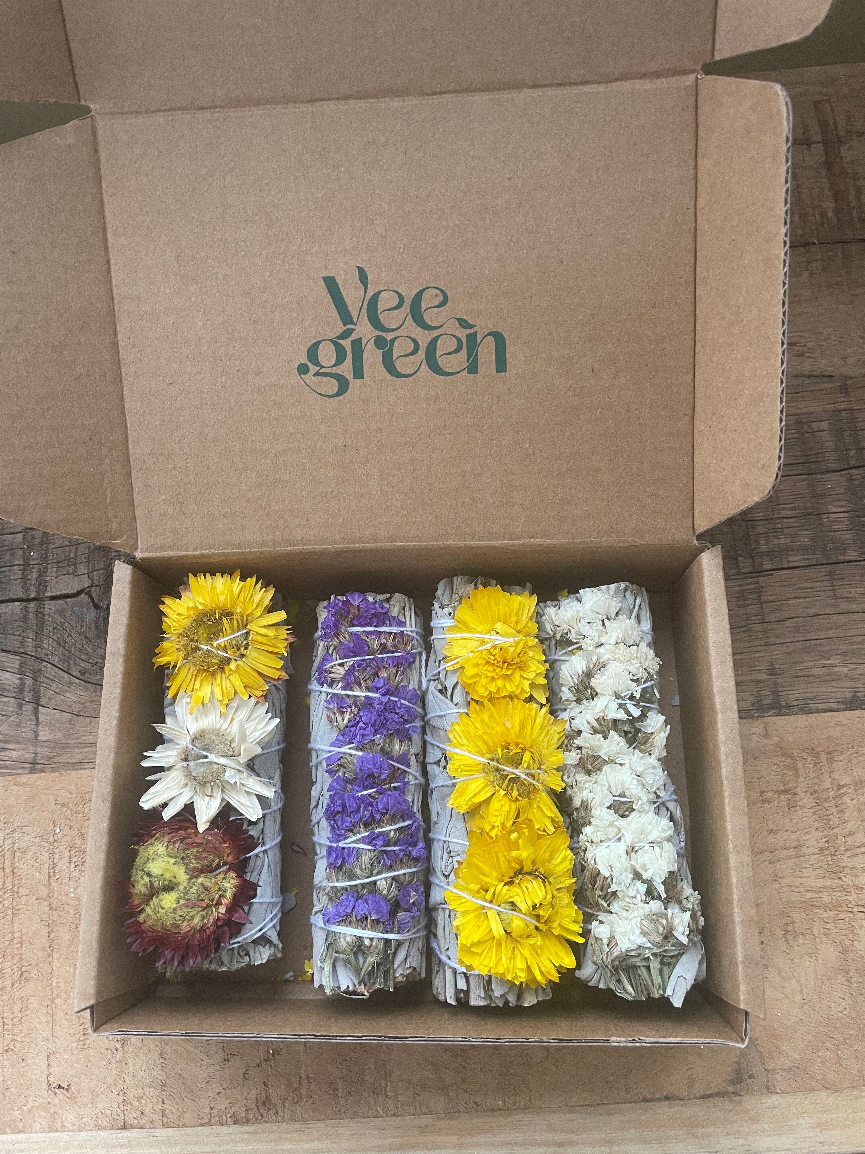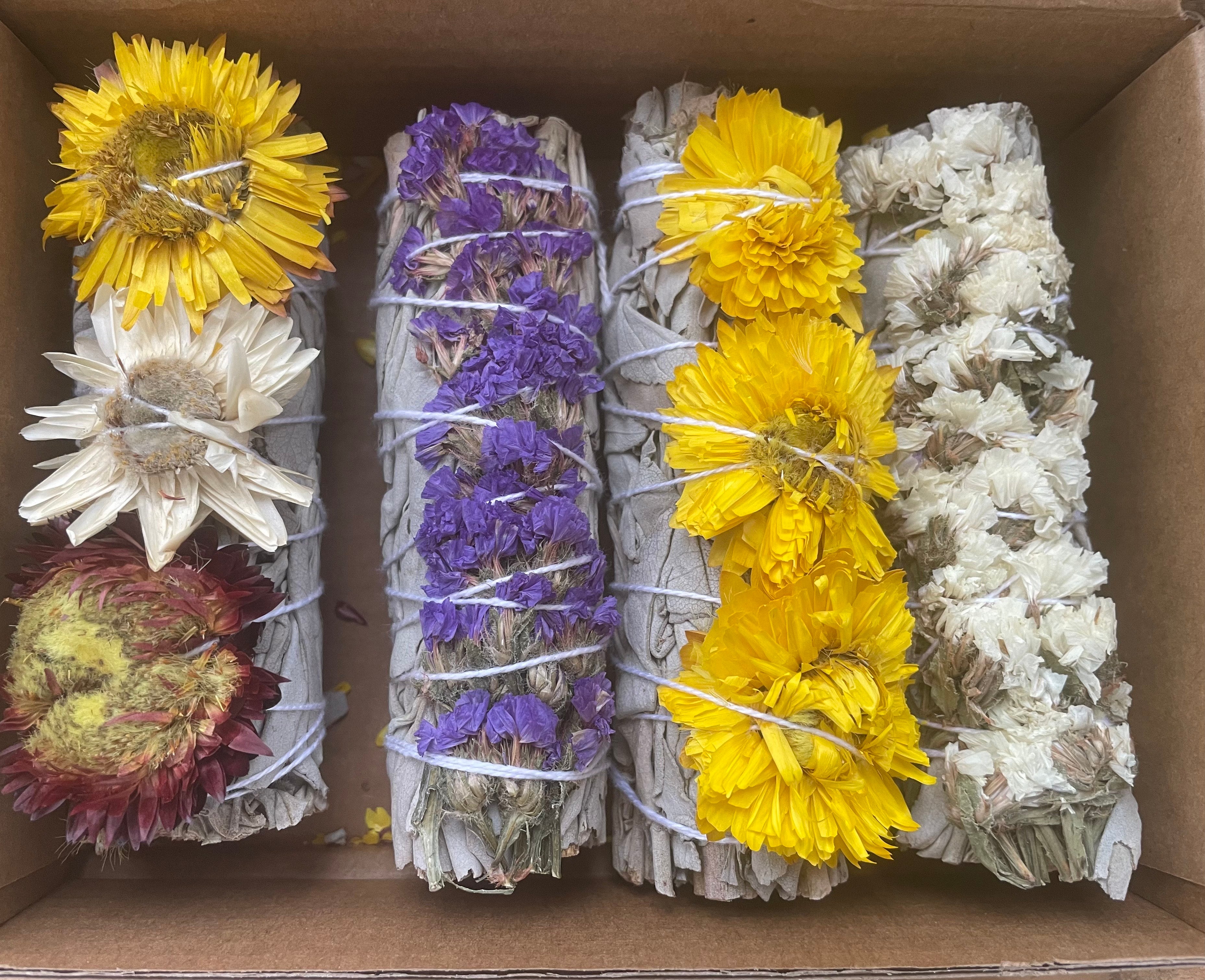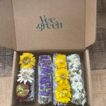 Et poetisk sæt bestående af fire bundter hvid salvie, hver omhyggeligt dekoreret med tørrede strand-immortelleblomster. Hvert bundt har sin egen unikke energi – beroligende, lysende eller opfriskende – og inviterer dig til at rense dit hjem, samtidig med at du hylder naturens skønhed og botaniske ritualer.