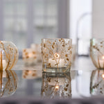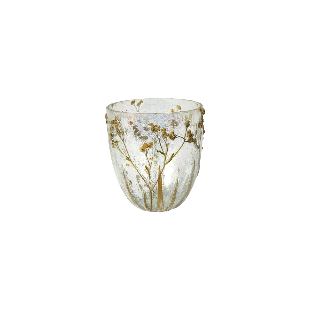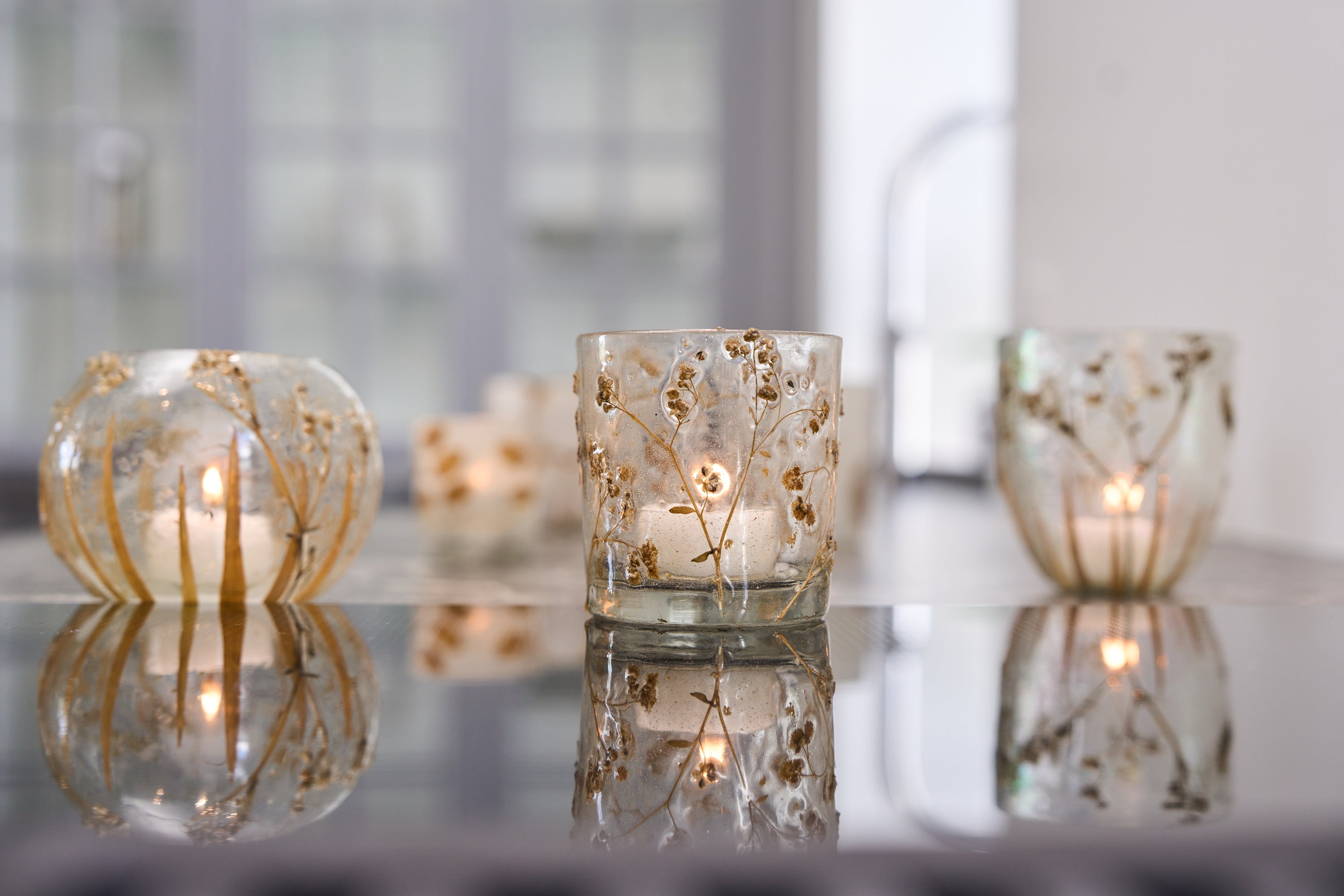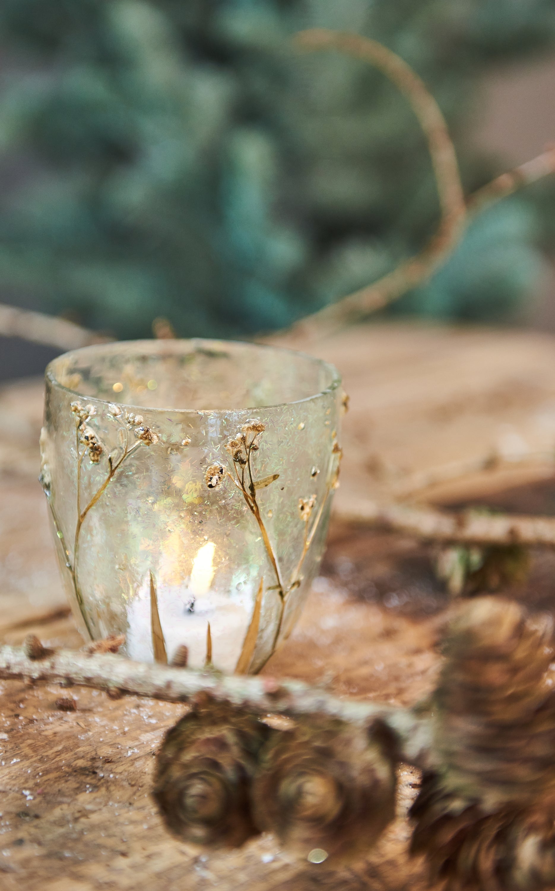 Denne glasfyrfadsstage er perfekt til dig, der ønsker stilfuld belysning og dekorative detaljer med et frisk og naturligt touch.