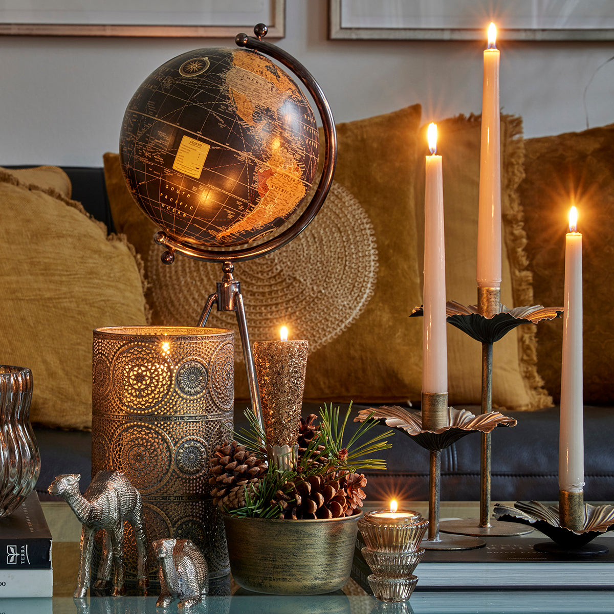 Stagen ideel til at placere på bordet, hylden eller skænken, hvor den kan skabe et iøjnefaldende blikfang. Den antik-guld finish giver et luksuriøst og tidløst udtryk, der passer ind i både moderne og klassiske indretninger.