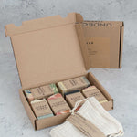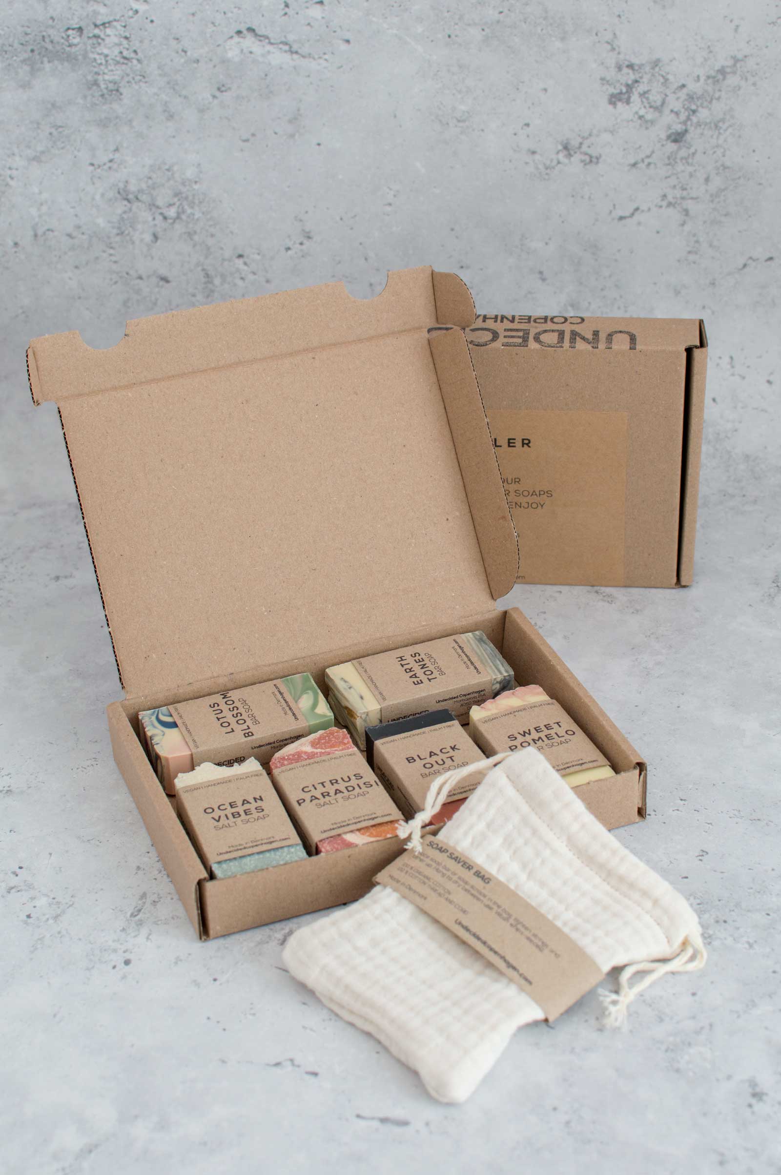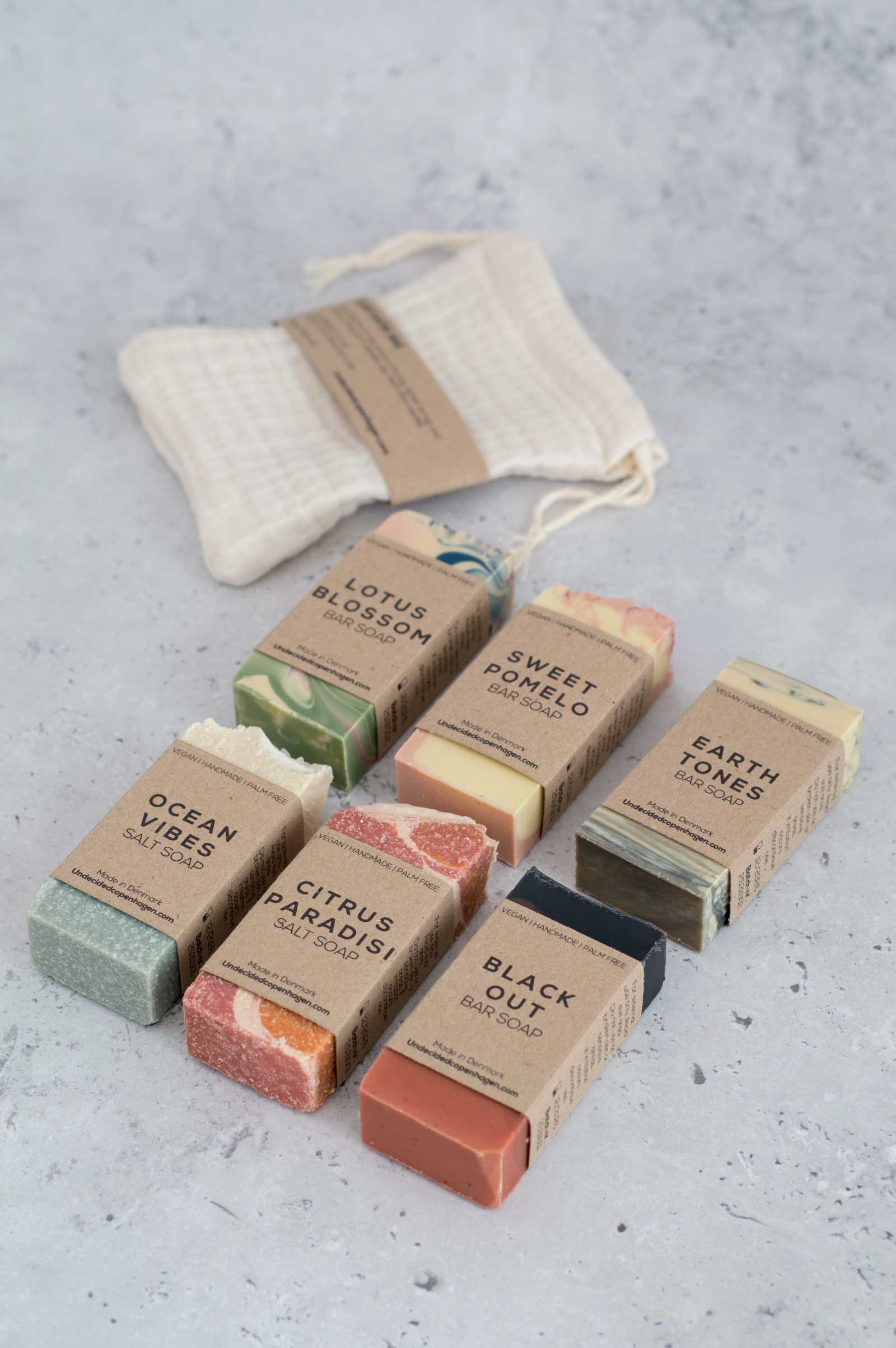 Dette sæt indeholder 6 håndlavede mini-sæber (45 g) samt en sæbesparende pose – perfekt som gave eller til dig, der vil prøve flere dufte.