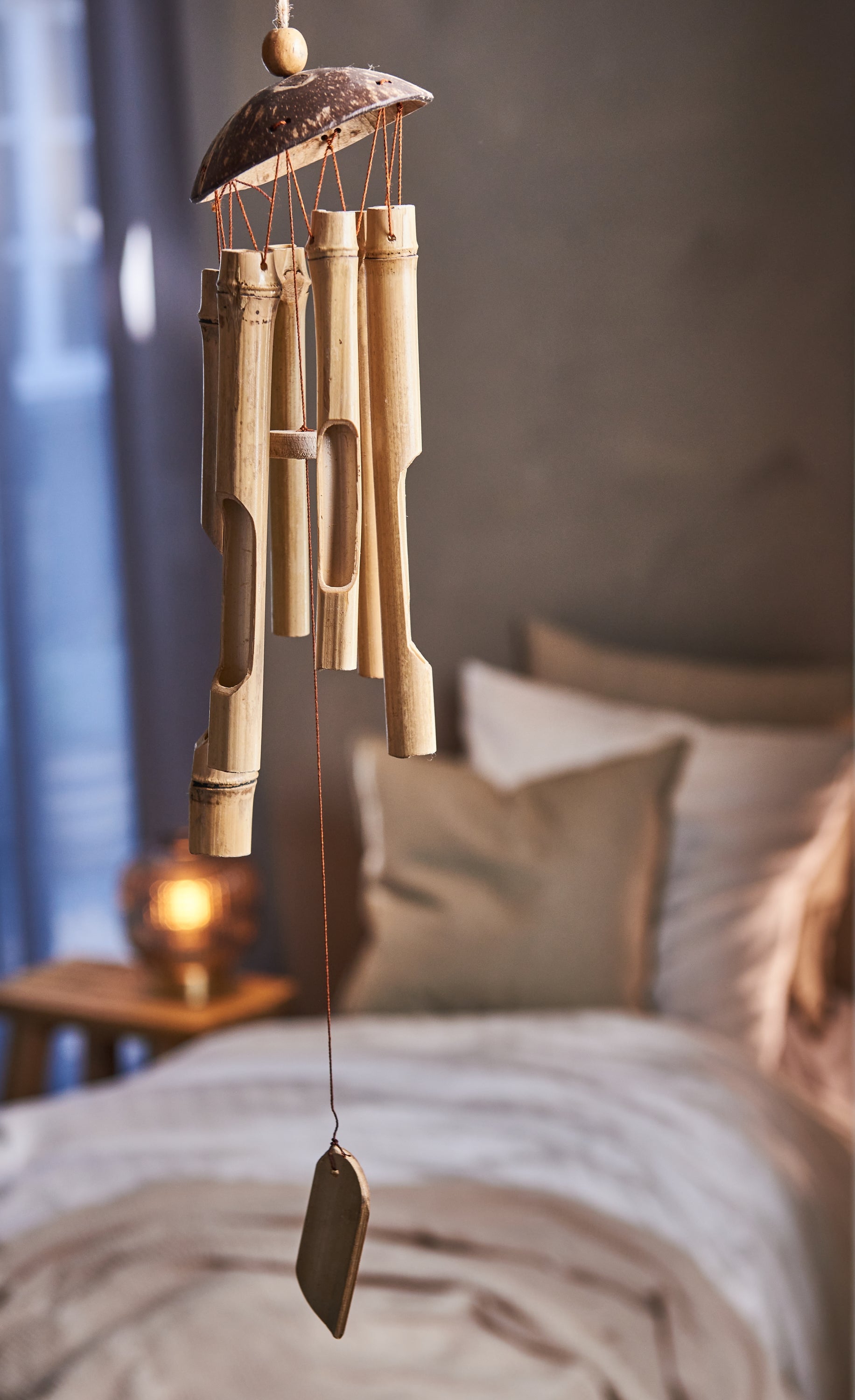Skab ro og harmoni i dit hjem eller udendørs med dette dekorative vindspil i bambus. De naturlige bambusrør frembringer blide og melodiske toner, når vinden bevæger sig, og tilføjer samtidig et æstetisk element til haven, altanen eller terrassen.